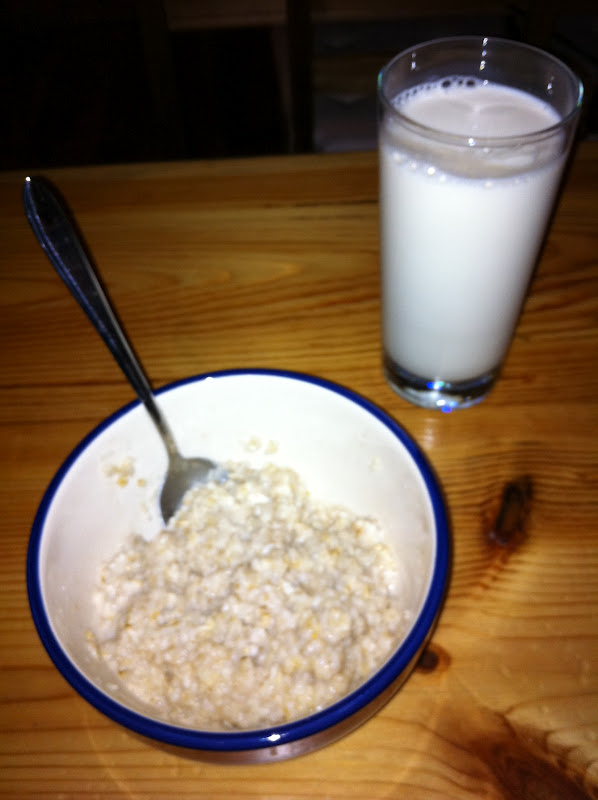 A bowl of Freedom Foods Quick Oats with a glass of Sanitarium So Good Regular Soy Milk.